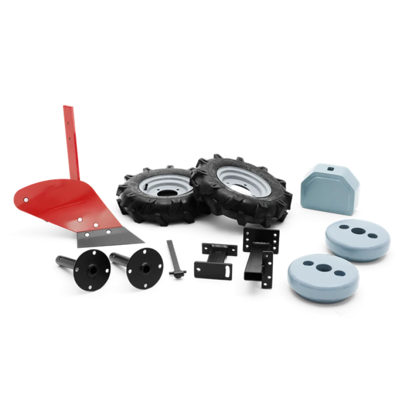 Complete ploeg en wielenset waarmee u over de aarde kunt rijden om rijen te maken en onkruid onder te spitten.