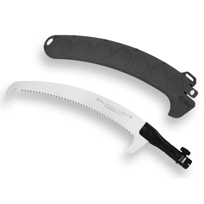 Zaagblad met hoes en dul voor Silky stokzaag Hayauchi 2400/3670/4900 en 6300, lengte blad 390 mm – 6,5 tanden per inch. (SILKY artikelnummer KZSI177401) Het 390 mm lange gebogen blad van de Hayauchi is voorzien van SilkyÕs unieke 4-RETSUME vertanding. Deze laser uitgesneden tanden, met een kerf van 2,3mm, zorgen voor een grote houtafname zodat u gemakkelijk en razendsnel de dikste takken doorzaagt zonder dat de zaag vast te komt te zitten. Het zaagblad is voorzien van Nikkel coating, is flexibel en alleen de vlijmscherpe tanden zijn impulsgehard. Twee messen (sikkels) op het blad zorgen samen voor een optimaal snoeiresultaat. Met het ondermes snijdt u de bast in, zodat deze niet langs de stam afscheurt als de tak valt. Het bovenmes voorkomt dat de zaag uit de zaagsnede raakt. En u kunt, met dit bovenmes, eenvoudig twijgjes van de stam wegsnijden of kleine (dode) takken mee uit de boom trekken. De naam Hayauchi is een samenvoeging van de Japanse benamingen voor ÔsnelÕ (haya) en ÔzagenÕ (uchi). Snoeien op afstand vraagt om een betrouwbare en veelzijdige zaag. Silky zagen worden wereldwijd gebruikt door professionals en door kwaliteit liefhebbers. Geproduceerd in Japan sinds 1919 uit hoogwaardig SK-4 Carbonmetaal.